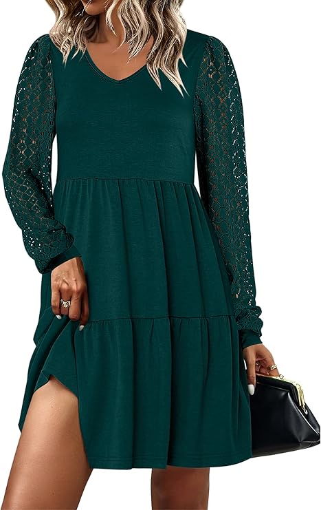 ANRABESS Dresses for Women Casual Lace Long Sleeve V Neck Tiered Swing Flowy Loose A-line Mini Short 2025 Fall Vacation Dress
